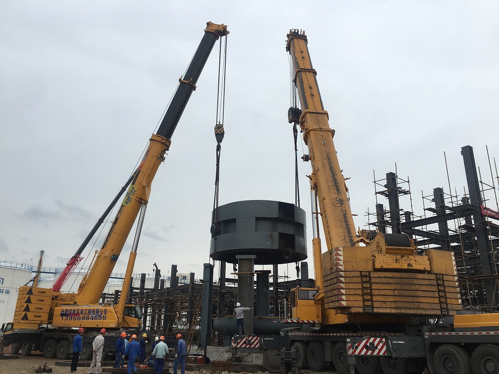 本次吊裝的反應器中段部分重達220噸,分公司領導高度重視,吊裝前期,邀請公司總工吳繼成、總工辦主任牛守義和安全部王岳濤經理親臨項目部參與設備吊裝的專題方案討論定稿工作。當日上午,吊裝現場準備工作緊張卻又有條不紊的進行,項目經理李子鳳向全體“參戰”員工進行了安全交底,工作人員對兩臺分別為500T、350T吊車的站位及性能再次確認,現場機具、人員均按既定方案實施。分公司經理史崇松、業主單位負責人、監理全程在現場“督戰”,全體工作人員經過四個小時的奮戰,吊裝作業圓滿結束。