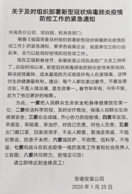 二是部署到位。疫情防控工作開展后,1月25日(大年初一)安徽安裝公司發(fā)出防控疫情工作的緊急通知,1月27日制定肺炎疫情防控措施,對疫情防控工作進(jìn)行細(xì)化安排,周密部署。要求各分公司、直屬項(xiàng)目部、各部門要以對職工群眾生命安全高度負(fù)責(zé)的態(tài)度,精準(zhǔn)施策,堅(jiān)決遏制疫情在安徽安裝公司輸入、蔓延,鼓勵(lì)職工戴口罩、勤洗手、多通風(fēng)、少走動(dòng)、常消毒。