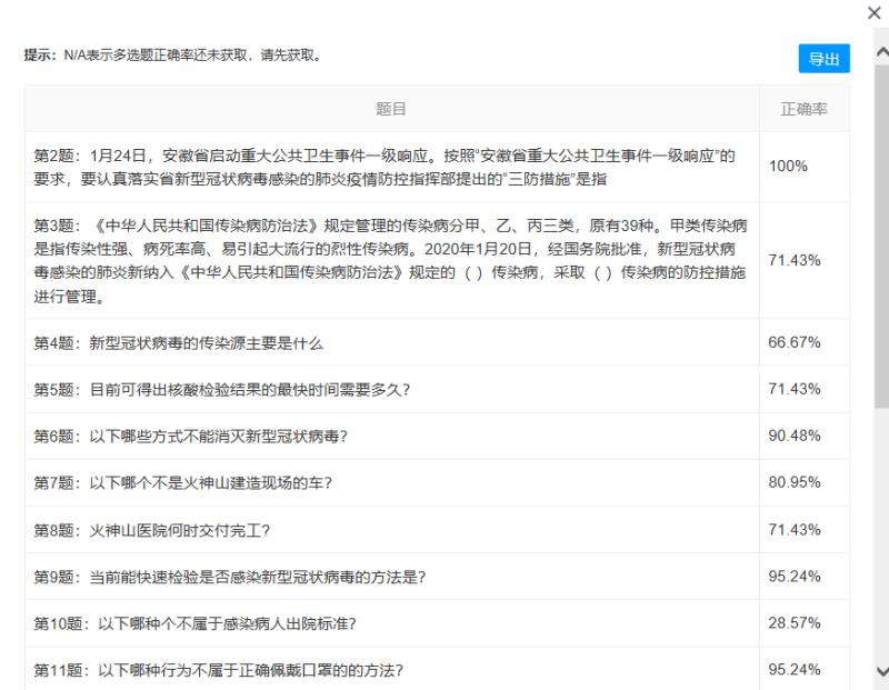 本次疫情防控知識答題通過在分公司微信群發送答題鏈接開展,內容涵蓋新冠肺炎基本知識、疫情防控措施、員工居家防控等多項內容,同時還對上級在疫情期間下發的各類疫情防控工作指導意見、措施等進行了宣貫。此次活動,員工參與率達到了100%,不僅加強了員工對防疫知識的了解,還提高了預防疾病自我保護的意識,防疫知識掌握情況總體較好。通過參與答題,廣大員工進一步了解了新冠肺炎的傳播途徑及相關防護措施,表示要努力做到認真理性對待疫情,保持良好個人生活習慣和公共衛生習慣,遵守疫情防控工作要求,胸懷全局、統一思想,堅決打贏疫情防控阻擊戰。