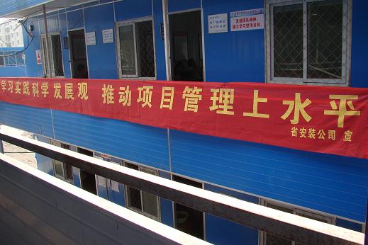 省政務(wù)服務(wù)中心及綜合樓和合肥中心醫(yī)院項(xiàng)目屬省、市重點(diǎn)工程之一。由多家大中型施工企業(yè)共同承建。我公司承擔(dān)的安裝工作量分別在1582萬和2800萬以上,是具有相當(dāng)規(guī)模和社會影響的工程項(xiàng)目。合肥項(xiàng)目黨支部在開展第二批實(shí)踐科學(xué)發(fā)展觀活動中,因地制宜地開展宣傳活動。分別在這兩個項(xiàng)目施工現(xiàn)場懸掛了《深入開展學(xué)習(xí)實(shí)踐科學(xué)發(fā)展觀活動》和《學(xué)習(xí)實(shí)踐科學(xué)發(fā)展觀推動項(xiàng)目管理上水平》的橫幅標(biāo)語。目前是整個施工現(xiàn)場開展學(xué)習(xí)實(shí)踐科學(xué)發(fā)展觀活動中唯一在現(xiàn)場宣傳的一家施工企業(yè)。