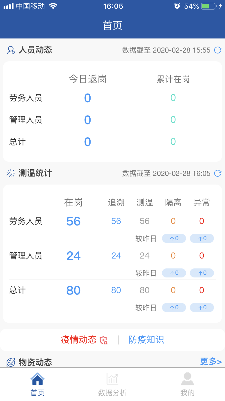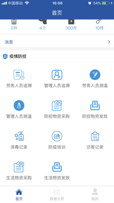 項(xiàng)目全面推行“返崗復(fù)工疫情防控系統(tǒng)”APP。主頁面包括勞務(wù)人員追溯、勞務(wù)人員測溫、防控物資采購、消毒記錄、疫情培訓(xùn)等11個專題版面,通過這些功能可線上及時填報人員返崗日期、體溫、癥狀及是否為留守人員等詳細(xì)信息,還有項(xiàng)目部的疫情物資采購情況、環(huán)境衛(wèi)生的消殺情況等相關(guān)信息,使上線人員時時了解疫情防控動態(tài),充分借助信息技術(shù)手段,全力打贏疫情防控“戰(zhàn)役”。 借助這一平臺確保項(xiàng)目部實(shí)時、準(zhǔn)確、有效地掌握現(xiàn)場人員的健康情況,助力疫情防控工作。