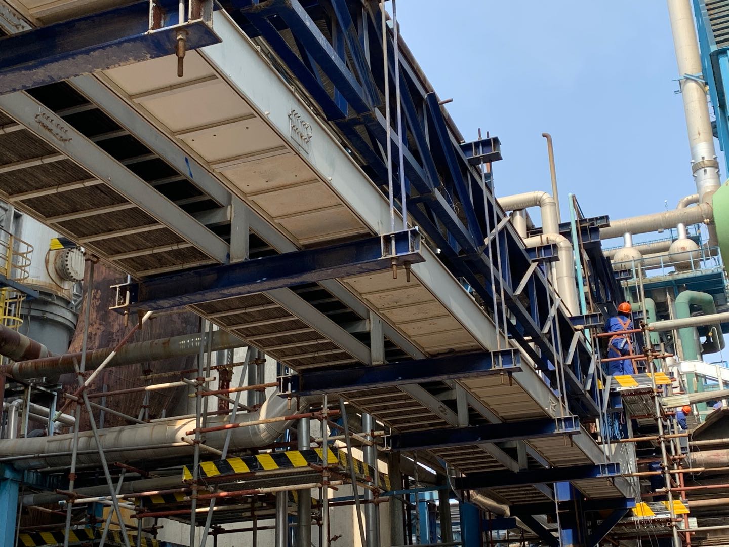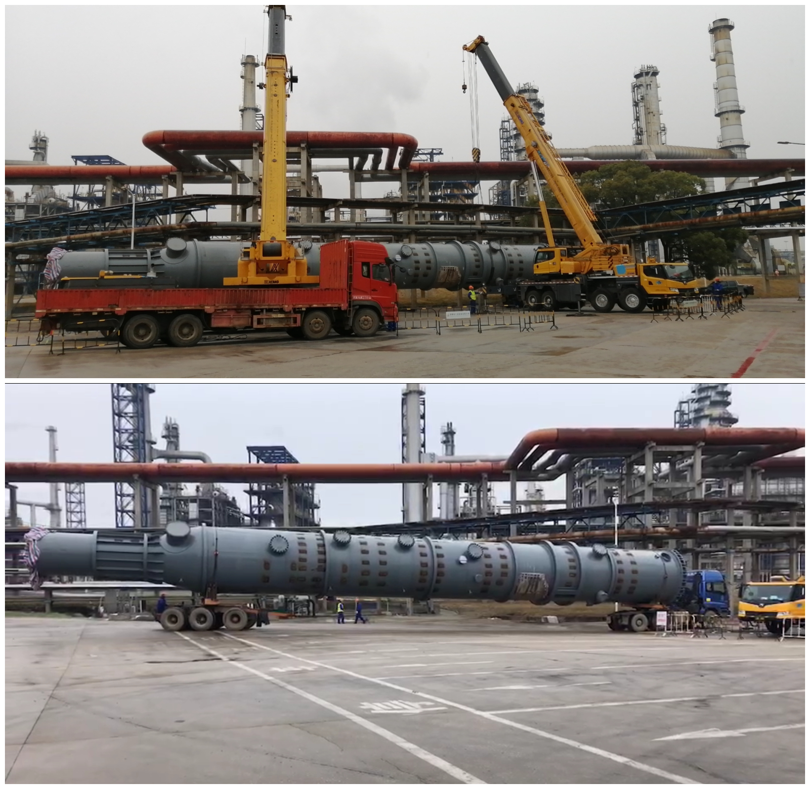 “Ⅰ、Ⅱ硫磺回收裝置增設(shè)煙氣后堿洗流程項(xiàng)目”是能使煙氣SO2排放濃度從原先的50mg/m3下降至≤10mg/m3的環(huán)保工程。但該項(xiàng)工程僅一個(gè)脫硫塔下段就高達(dá)33米,重達(dá)58噸,體積十分龐大,而現(xiàn)場(chǎng)存在作業(yè)場(chǎng)地狹小,固有障礙物多、吊重荷載大等諸多問(wèn)題,無(wú)法將設(shè)備一次性運(yùn)至施工現(xiàn)場(chǎng)并進(jìn)行下段焊接梯子、平臺(tái)等附塔“穿衣戴帽”作業(yè)。對(duì)此,項(xiàng)目部多次優(yōu)化倒運(yùn)方案,提前合理部署,采用額定荷載分別為220噸和90噸的汽車吊實(shí)施雙機(jī)抬吊作業(yè)和專為公路橋梁設(shè)計(jì)使用的炮車運(yùn)輸,從而順利完成了倒運(yùn)工作。同時(shí),為爭(zhēng)取時(shí)間,安排班組實(shí)行夜間倒班制,管理人員輪班制,為接下來(lái)的脫硫塔“穿衣戴帽”和上下段空中組對(duì)焊接作業(yè)爭(zhēng)取了寶貴時(shí)間。