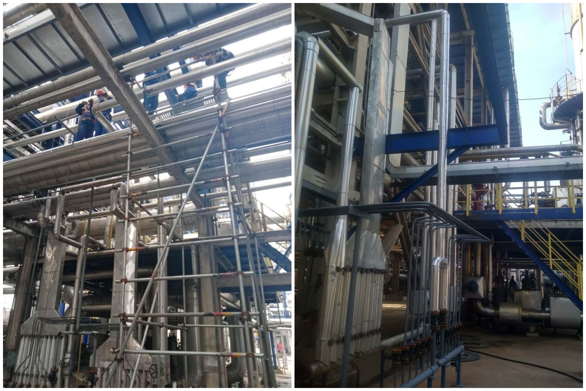 眾人拾柴火焰高,團(tuán)結(jié)起來(lái)勇向前。施工工人們?cè)诟鱾€(gè)項(xiàng)目現(xiàn)場(chǎng)忙著搭建腳手架、吊裝設(shè)備、焊接管道、敷設(shè)電纜、調(diào)試儀表、開挖基坑、排水及設(shè)備基礎(chǔ)的施工等等。現(xiàn)場(chǎng)管理人員也是有條不紊的按工序要求組織工人們交錯(cuò)施工,五個(gè)項(xiàng)目作業(yè)面全力展開……緊張繁忙的施工氣息撲面而來(lái)。