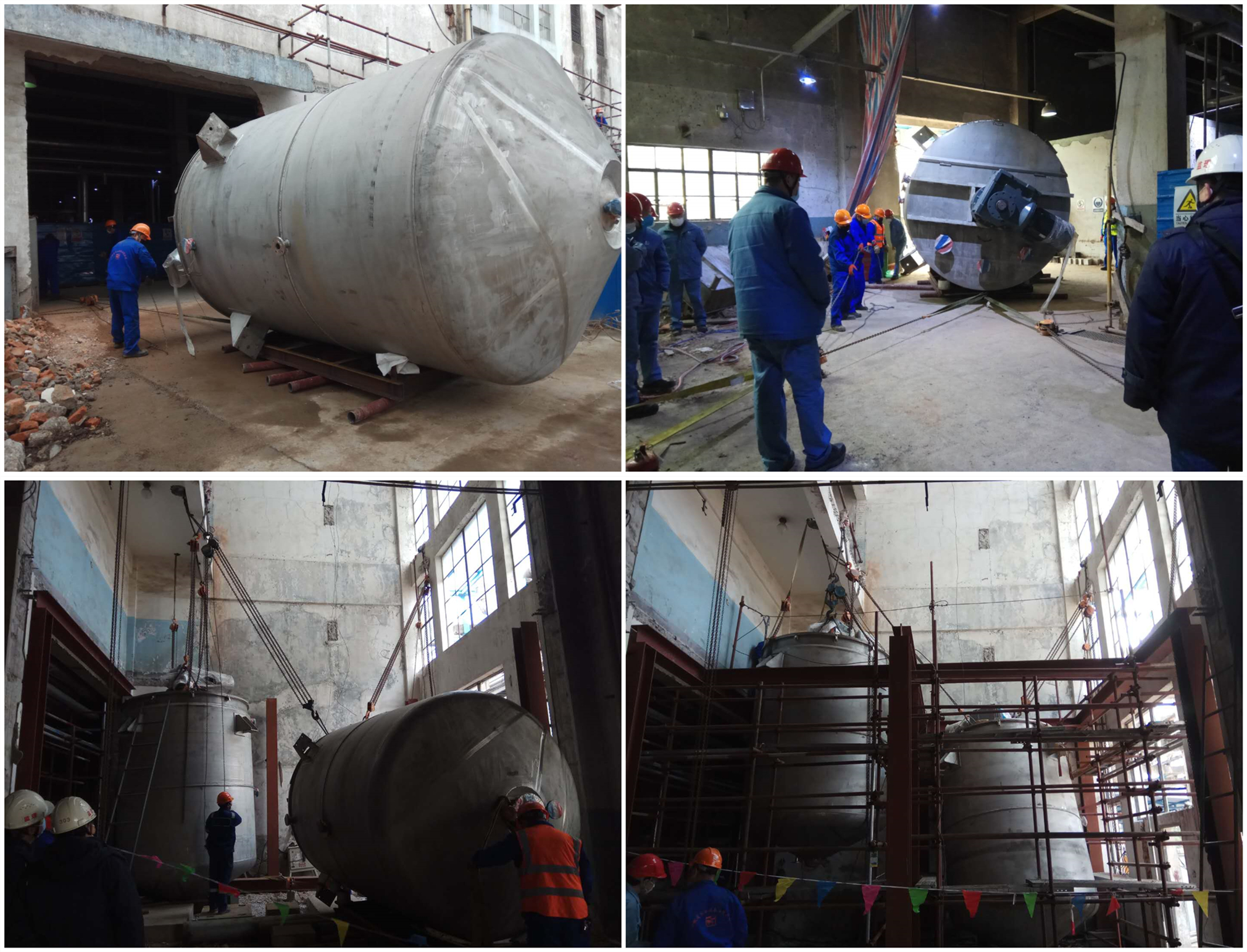 “腈綸阻燃纖維生產(chǎn)技術(shù)改造項(xiàng)目”的建成能夠使纖維產(chǎn)品起到防火阻燃的作用,創(chuàng)造更大經(jīng)濟(jì)效益,該項(xiàng)目屬于安慶石化重點(diǎn)項(xiàng)目。項(xiàng)目在施工過(guò)程中,由于安裝場(chǎng)地位于室內(nèi),運(yùn)輸和起重機(jī)械無(wú)法使用,導(dǎo)致2臺(tái)12噸、2臺(tái)8噸的配料罐無(wú)法簡(jiǎn)便運(yùn)輸和吊裝進(jìn)入室內(nèi)安裝,給施工人員造成極大的困擾。但方法總比困難多,經(jīng)項(xiàng)目部拿出具體施工方案與業(yè)主、監(jiān)理研究決定,利用最原始的滾杠搬運(yùn)辦法,再以原有房梁為吊點(diǎn),采用2個(gè)20噸手動(dòng)葫蘆吊裝、拉運(yùn)的方式順利將設(shè)備安裝就位。同時(shí)項(xiàng)目部合理安排人員加班加點(diǎn),為后期機(jī)泵安裝及工藝管道、鋼結(jié)構(gòu)、電氣儀表、防腐保溫等配套設(shè)施施工爭(zhēng)分奪秒,力爭(zhēng)3月31日完成共混單元所有施工,為業(yè)主平穩(wěn)生產(chǎn)產(chǎn)品,創(chuàng)造效益打下堅(jiān)實(shí)基礎(chǔ),也為安徽安裝的發(fā)展打下良好的口碑。