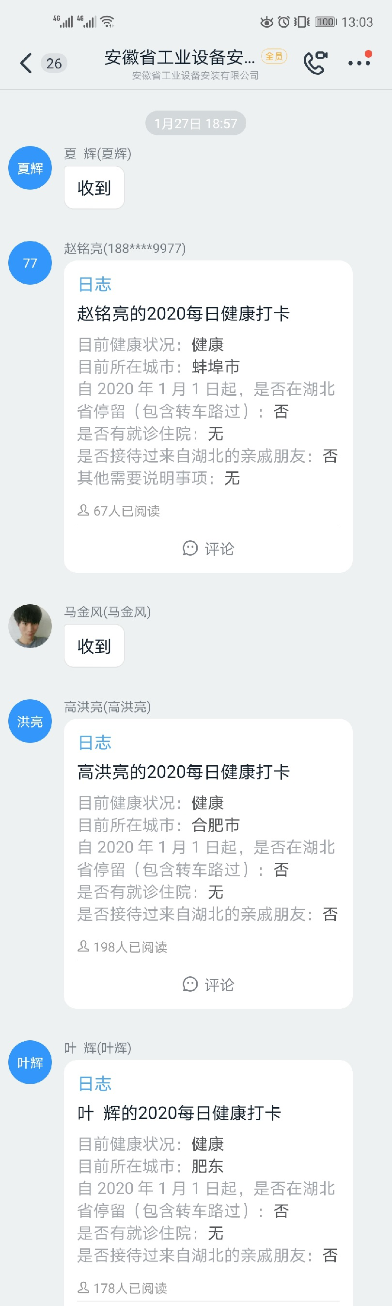 1月27日(大年初三),公司下發《安徽安裝公司關于做好新型冠狀病毒肺炎疫情工作的防控措施》,全體員工每日在釘釘日志專項報告當日去向及身體狀況,各分公司、各部門認真做好登記,確保信息及時準確,時刻密切關注員工的身體健康狀況。