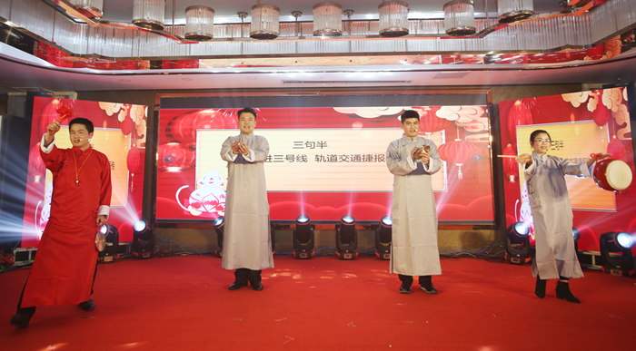 整場聯(lián)歡會由歌伴舞、朗誦、合唱、小品、樂器演奏、三句半、黃梅戲、音詩畫等16個節(jié)目組成,均為職工自編自導(dǎo)自演。在歌伴舞《今天是你的生日中》中,聯(lián)歡會正式拉開序幕。《省安贊》以改編版黃梅戲劇的形式為公司送上美好的祝愿;配樂詩朗誦《春風(fēng)浩蕩啟新程,揚帆起航再出發(fā)》展現(xiàn)了安徽安裝人團結(jié)奮進,一往無前的精神風(fēng)貌;三句半《拼搏奮進三號線,軌道交通捷報傳》以幽默的方式講述了軌道交通3號線合肥大劇院站項目部上的故事;音詩畫《奮斗是青春最亮麗的底色》講述了新疆烏蘇管廊、中水回用項目榮獲“安徽省工人先鋒號”背后的故事,向全體奮戰(zhàn)在項目施工一線的安徽安裝人致敬...歡快的旋律,優(yōu)美的舞姿,幽默的小品,豪邁的朗誦將現(xiàn)場的氣氛推向高潮,贏得了現(xiàn)場觀眾的歡呼喝彩與陣陣掌聲。