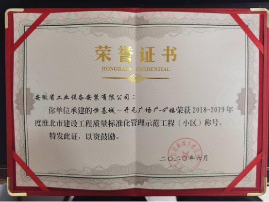 近日,安徽安裝公司承建的淮北恒基城開元廣場項目工程榮獲“2018--2019年度淮北市建設(shè)工程質(zhì)量標準化管理示范工程(小區(qū))”稱號。
