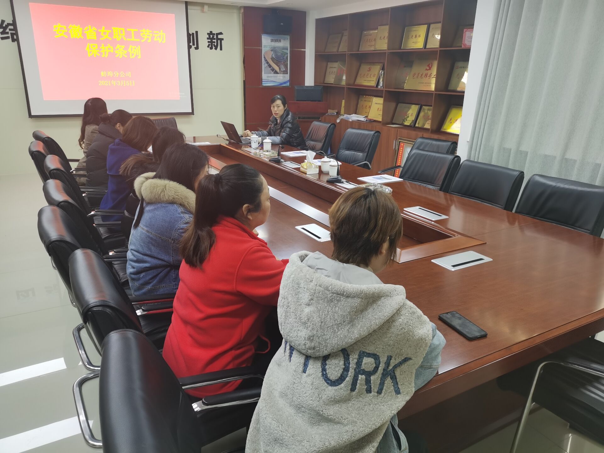 陽春三月,百草初醒,萬木崢嶸,值此第“111”個三八國際勞動婦女節來臨之際,3月5日下午,蚌埠分公司工會開展了《女職工勞動保護特別規定》知識講座活動。講座由分公司黨支部書記程茂麗組織,分公司全體女職工聆聽講座。