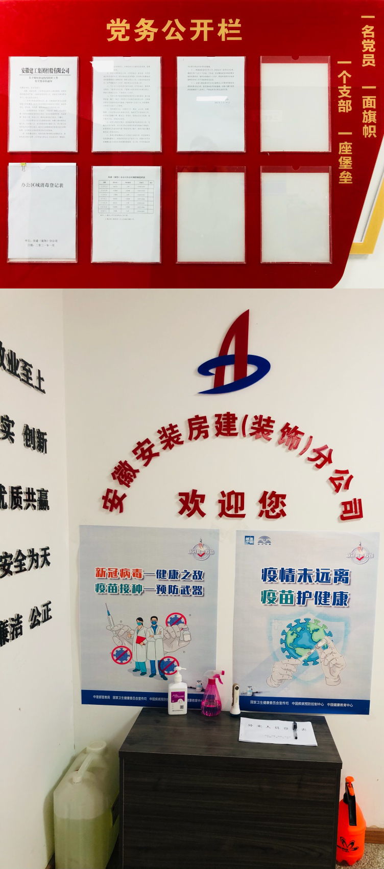 近期,安徽安裝房建(裝飾)分公司黨支部迅速落實集團公司黨委和公司黨委疫情防控有關工作部署,針對分司機關及所屬各項目疫情防控工作作出具體要求:一是要分公司機關、各項目部針對來訪人員及時做好測溫、登記工作;二是要加強辦公區(qū)、項目食堂等人員易集中區(qū)域的日常衛(wèi)生消殺工作;三是要積極做好疫苗接種宣傳工作,合理安排組織職工就近接種疫苗;四是要合理安排好項目食堂就餐時間,分批次、分時間段組織項目現(xiàn)場人員就餐,避免人員過度集中;五是要統(tǒng)籌做好疫情期間日常防護和生產(chǎn)經(jīng)營工作。