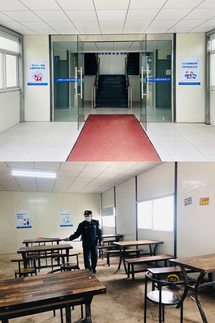 合肥潤迅數(shù)據(jù)中心項目部辦公區(qū)門口張貼防疫宣傳海報、食堂開展衛(wèi)生消殺
