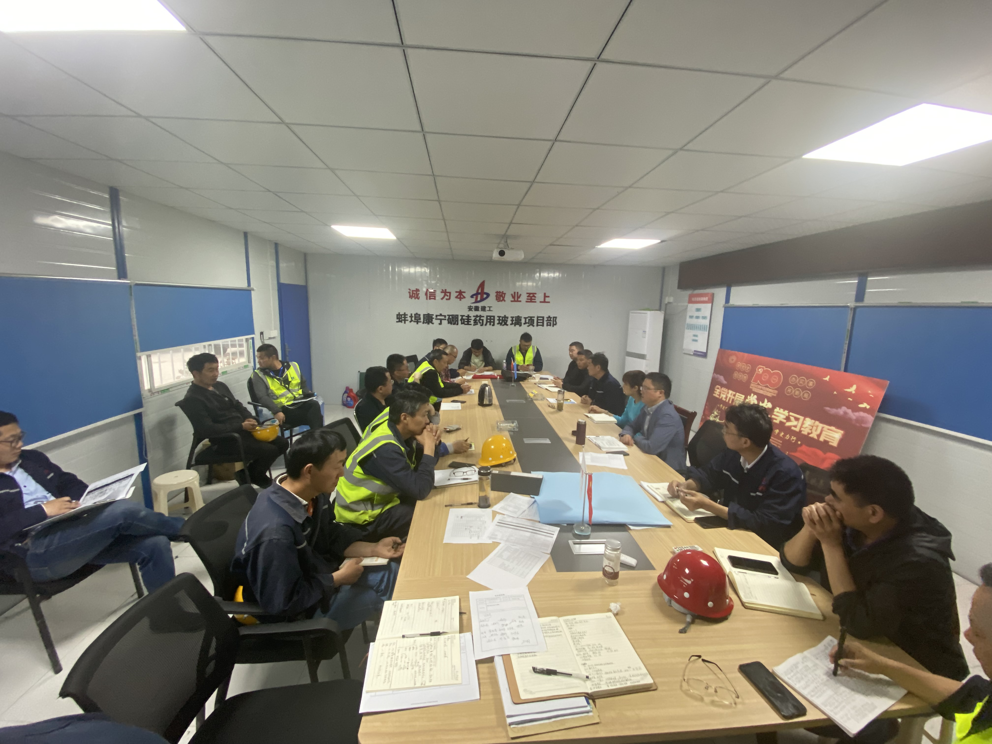 5月18日,雖然已是晚間八點多,但是位于蚌埠市中環(huán)線南、中糧大道以西的康寧藥用玻璃管項目現(xiàn)場到處是一片繁忙的景象。項目部會議室內(nèi)燈火通明,全體參戰(zhàn)人員正在召開項目協(xié)調(diào)推進會,而在不遠處的施工現(xiàn)場,機器設備聲轟鳴,百十名施工人員在各自的崗位上緊張而有序地忙碌著。