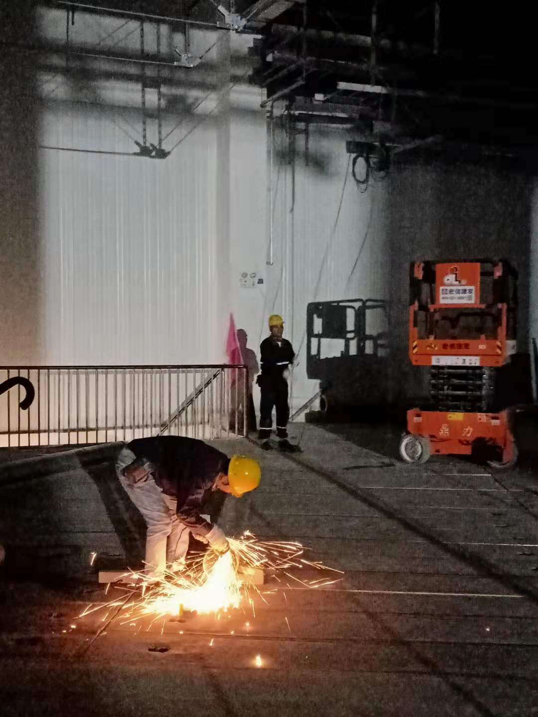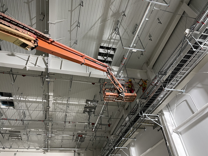 圖為室內(nèi)電氣班組正在進行高天棚燈具安裝,對剩余工程量進行最后的沖刺