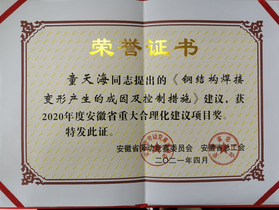 近日,由安徽省勞動競賽委員會和安徽省總工會聯合評選的“2020年度安徽省重大合理化建議項目獎”揭曉,安徽安裝公司童提出的《鋼結構焊接變形產生的成因及控制措施》成功入選。