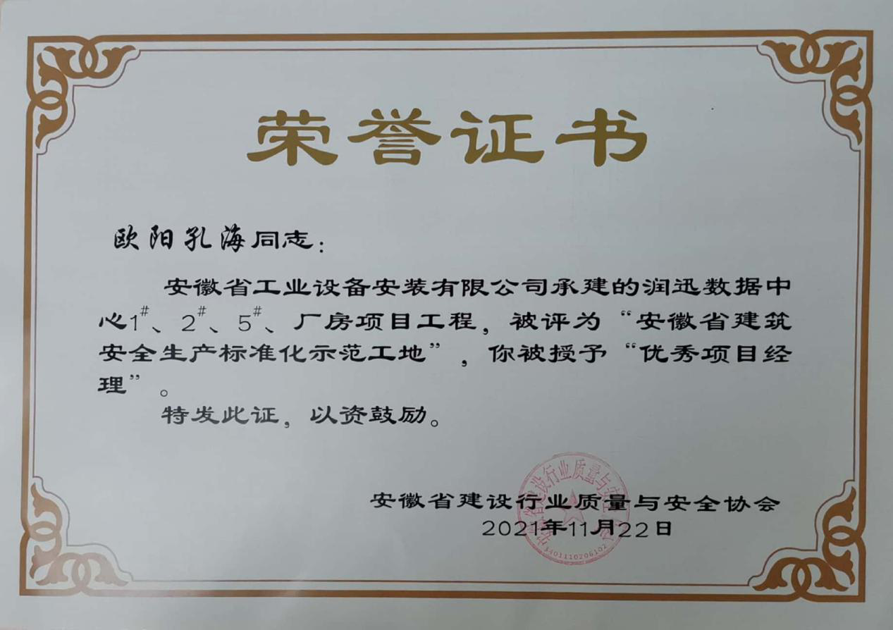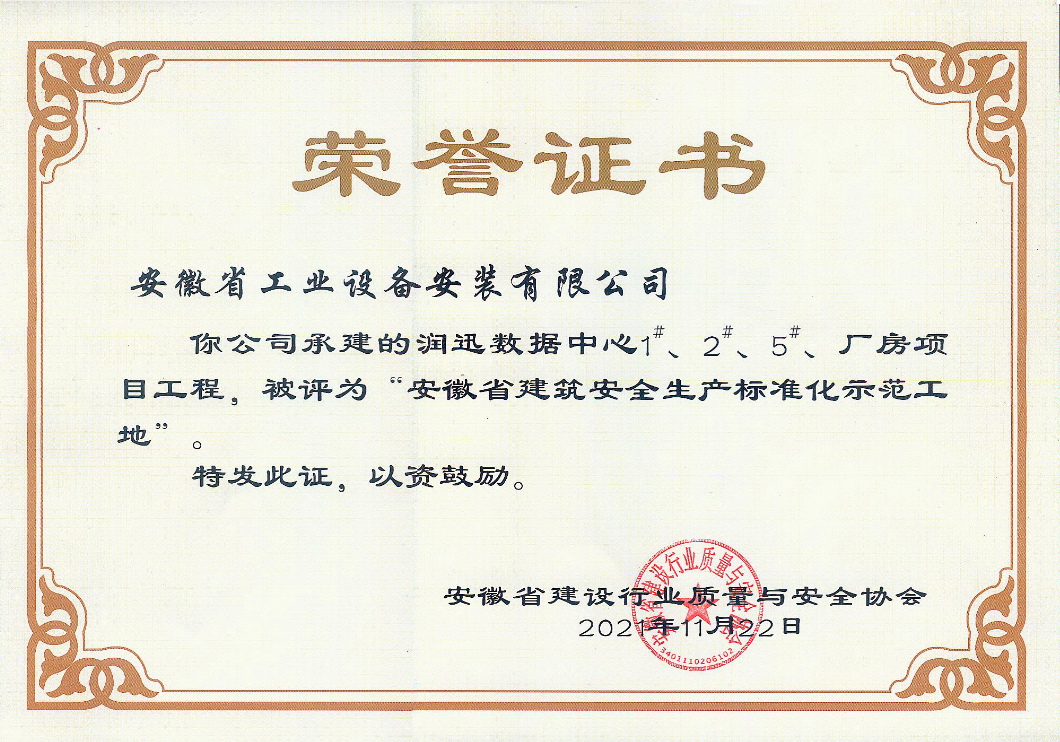 近日,安徽省工業(yè)設(shè)備安裝有限公司承建的潤(rùn)迅數(shù)據(jù)中心1#、2#、5#廠房項(xiàng)目工程榮獲2021年度“安徽省建筑安全生產(chǎn)標(biāo)準(zhǔn)化示范工地”榮譽(yù)稱號(hào)。