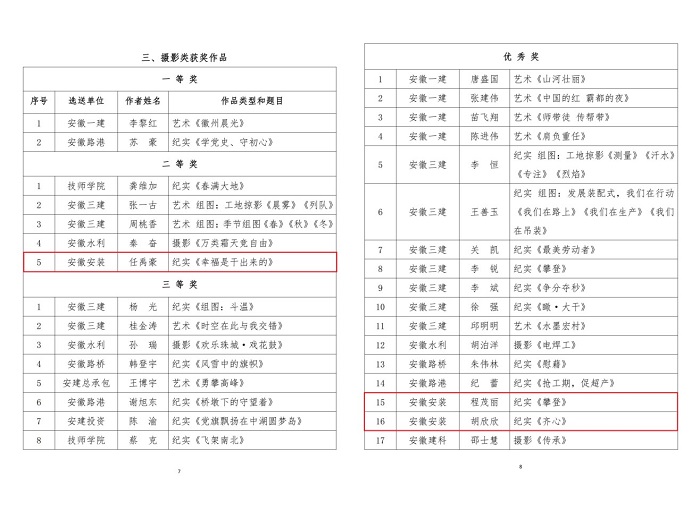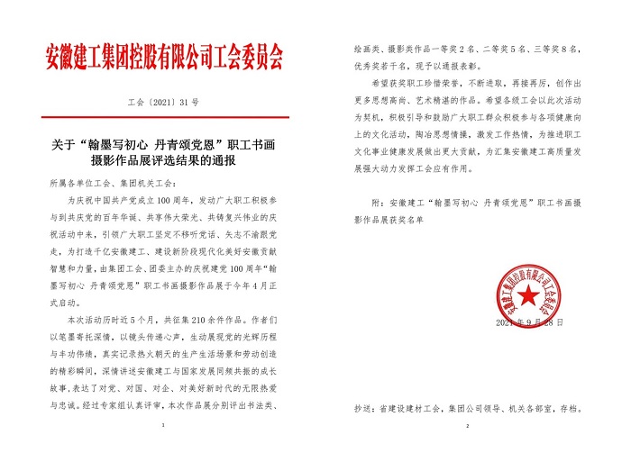 9月29日,集團公司工會通報了“翰墨寫初心 丹青頌黨恩”職工書畫攝影作品展評選結果,安徽安裝公司選送的五幅作品榜上有名。其中馬金鑫的油畫作品《支部建在項目上》榮獲繪畫類一等獎,任禹豪的攝影作品《幸福是干出來的》榮獲攝影類二等獎,化范寶的硬筆書法作品《沁園春·雪》和程茂麗的攝影作品《攀登》、胡欣欣的攝影作品《齊心》分別榮獲書法類優(yōu)秀獎和攝影類優(yōu)秀獎。