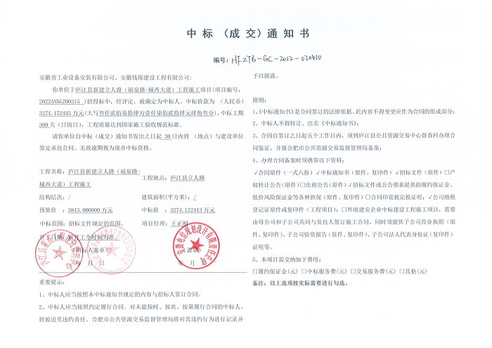 2022年8月12日,安徽安裝市政分公司在合肥市公共資源交易平臺上以聯合體牽頭人身份投標廬江縣新建立人路(福泉路-城西大道)工程施工項目并一舉中標!該項目是連接廬江縣福泉路與城西大道之間的道路,總長約1250米,規劃為雙向四車道,道路等級為次干路,設計時速40km/h;主要施工內容有道路工程、排水工程、綠化工程、照明工程、交通(土建)以及其他附屬工程等,中標金額3274.17萬元。