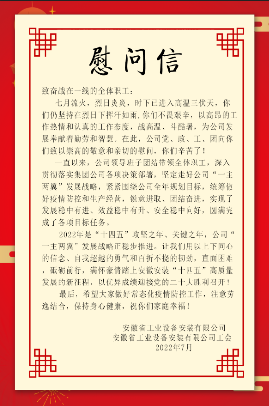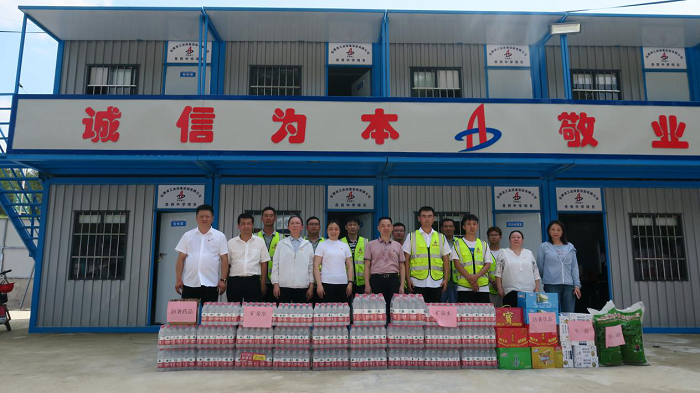 公司工會先后來到岳西中學建設項目(一期)安裝工程項目、中石化安慶分公司煉油轉化工200噸/小時污水汽提裝置項目、舒城第一中學遷建項目、四水廠DN1800、DN1400供水管道遷建工程管網項目、花園大道(徽州大道-包河大道)道路工程項目、定遠壹石通化學科技廠房項目、凱盛科技超薄柔性玻璃(UTG)二期5#、6#車間及配套設施工程項目,給廣大一線職工送去白糖、綠豆、礦泉水、飲料、藥品等防暑降溫物品,將工會組織的關心關愛傳遞給項目職工。