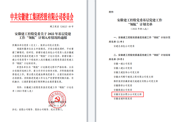 經(jīng)過前期充分準(zhǔn)備以及集團(tuán)嚴(yán)格篩選研究,安徽安裝合肥分公司黨支部于近日成功入選集團(tuán)基層黨建工作“領(lǐng)航”計(jì)劃培育庫。下一步,合肥分公司黨支部將以此為契機(jī),注重實(shí)踐探索和總結(jié)提煉,大力開展黨建品牌建設(shè),并充分發(fā)揮榜樣示范作用,帶動更多的黨支部能有機(jī)會入選“領(lǐng)航”計(jì)劃培育庫,持續(xù)推進(jìn)公司黨建工作與生產(chǎn)經(jīng)營管理同頻共振、有機(jī)融合,以高質(zhì)量黨建引領(lǐng)保障企業(yè)高質(zhì)量發(fā)展。