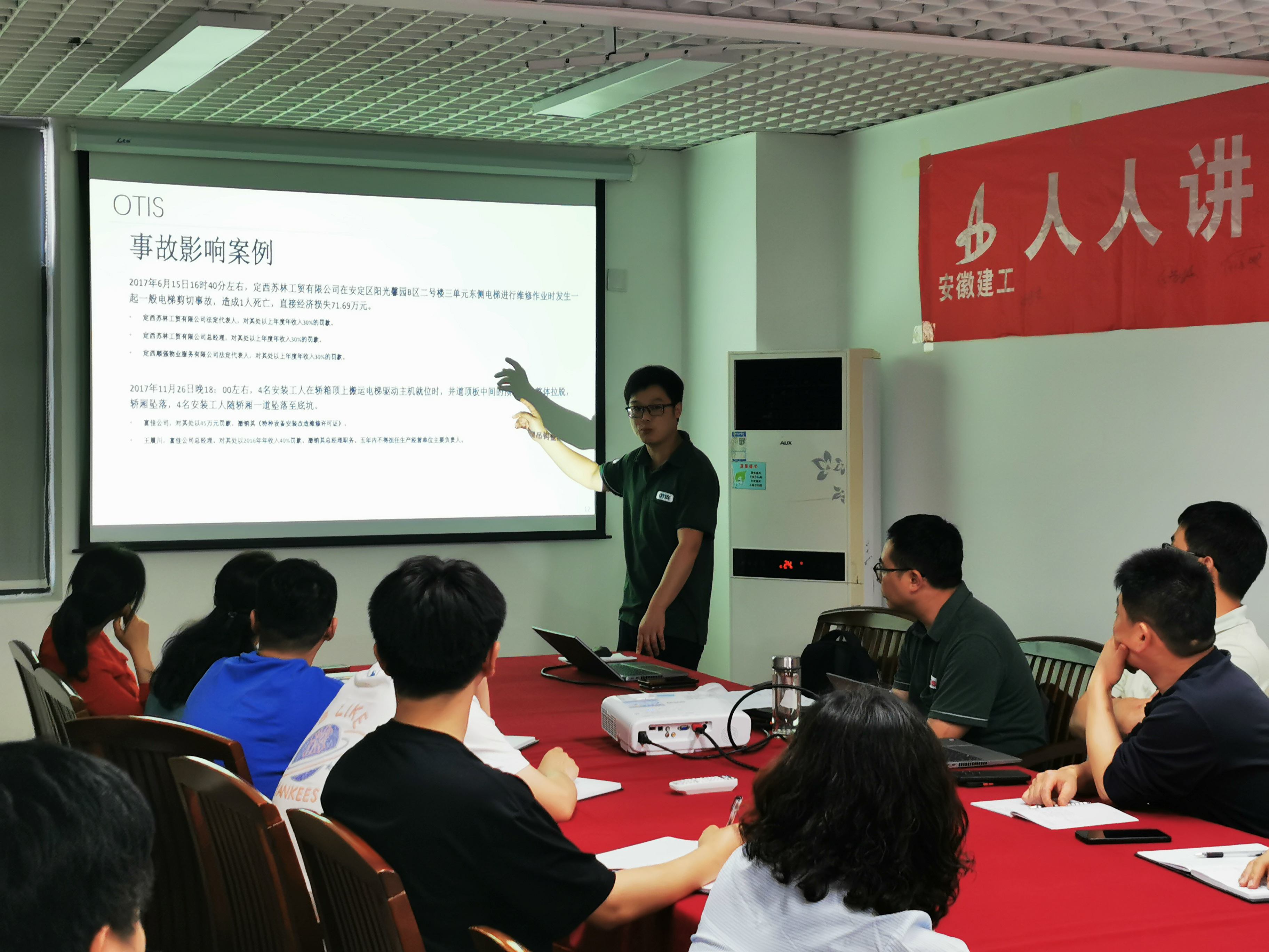 培訓(xùn)由奧的斯電梯(中國(guó))有限公司安徽分公司安全工程師徐長(zhǎng)江、項(xiàng)目經(jīng)理張文翔及調(diào)試工程師王威為大家授課。三位授課老師結(jié)合多年從事電梯行業(yè)的經(jīng)驗(yàn),從安全管理責(zé)任、安全教育培訓(xùn)、安全事故案例分析、電梯安裝調(diào)試中易錯(cuò)點(diǎn)及電梯安裝行業(yè)容易導(dǎo)致重傷及死亡事故的原因等方面全面、系統(tǒng)地講解了電梯施工現(xiàn)場(chǎng)容易出現(xiàn)的各類安全隱患,深度剖析了隱患可能引發(fā)的各類安全事故,各種事故隱患的防護(hù)措施及在發(fā)生緊急情況時(shí)如何做好事故處理等。