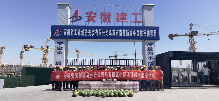 6月的新疆,烈日當(dāng)頭、酷暑難耐,新疆烏蘇市氣溫一度沖破38℃,給一線施工人員帶來嚴(yán)峻的“烤”驗(yàn)。為了確保烏蘇市南苑新城小區(qū)住宅樓建設(shè)項(xiàng)目施工進(jìn)度不滯后,項(xiàng)目部管理人員及一線工人斗烈日、戰(zhàn)酷暑,加班加點(diǎn)、揮汗如雨、搶抓進(jìn)度。近日,新疆烏蘇分公司南苑新城項(xiàng)目部組織“送清涼”活動(dòng),為一線工人送去礦泉水、西瓜、綠豆、冰糖、藿香正氣水、十滴水等防暑降溫物品,并叮囑他們高溫季節(jié)施工,一定保護(hù)好自己身體。
