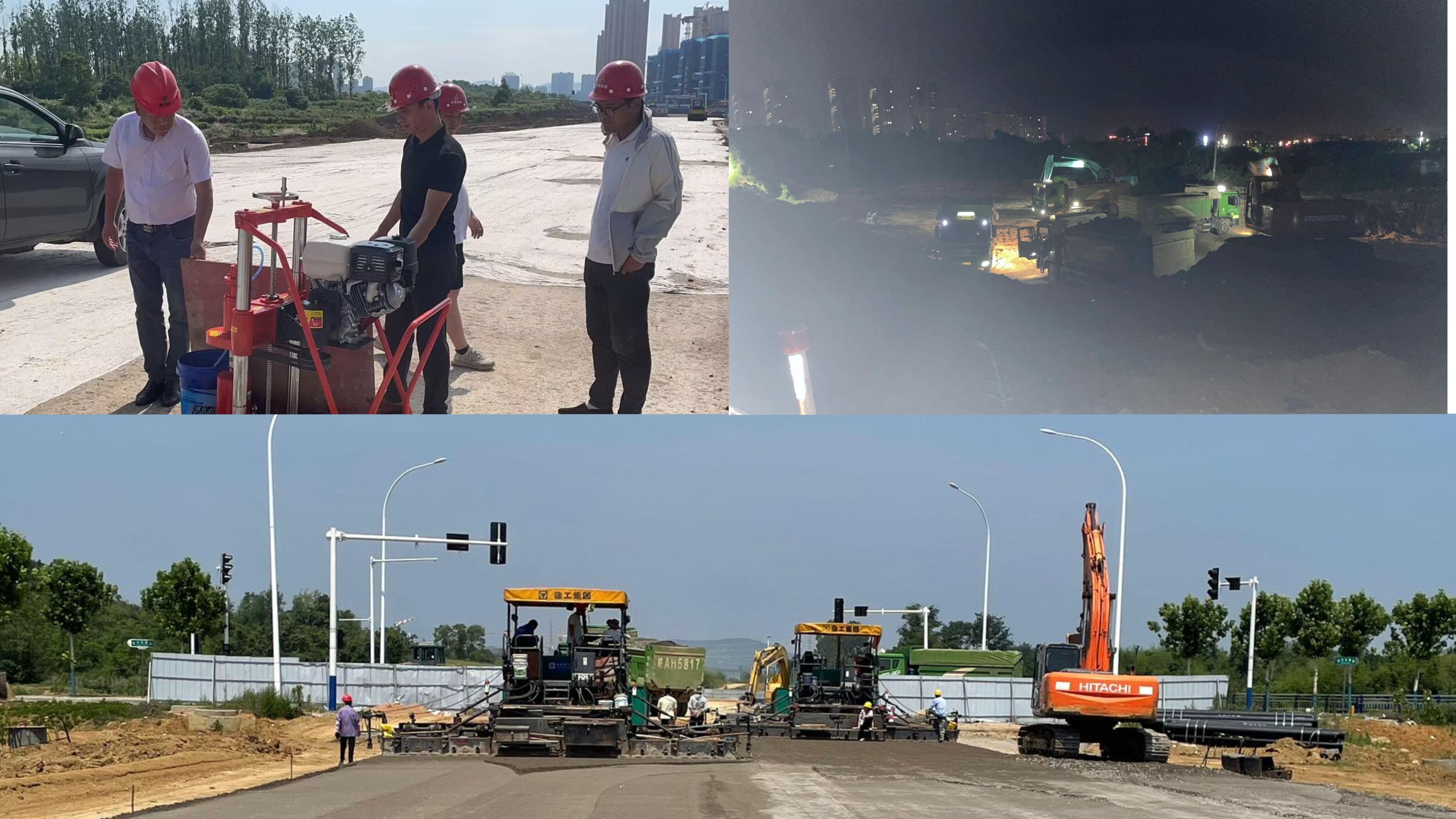 圖為:廬江縣新建立人路(福泉路-城西大道)工程水穩(wěn)取芯試驗(yàn)、土方夜間外運(yùn)及快車道水穩(wěn)攤鋪碾壓施工