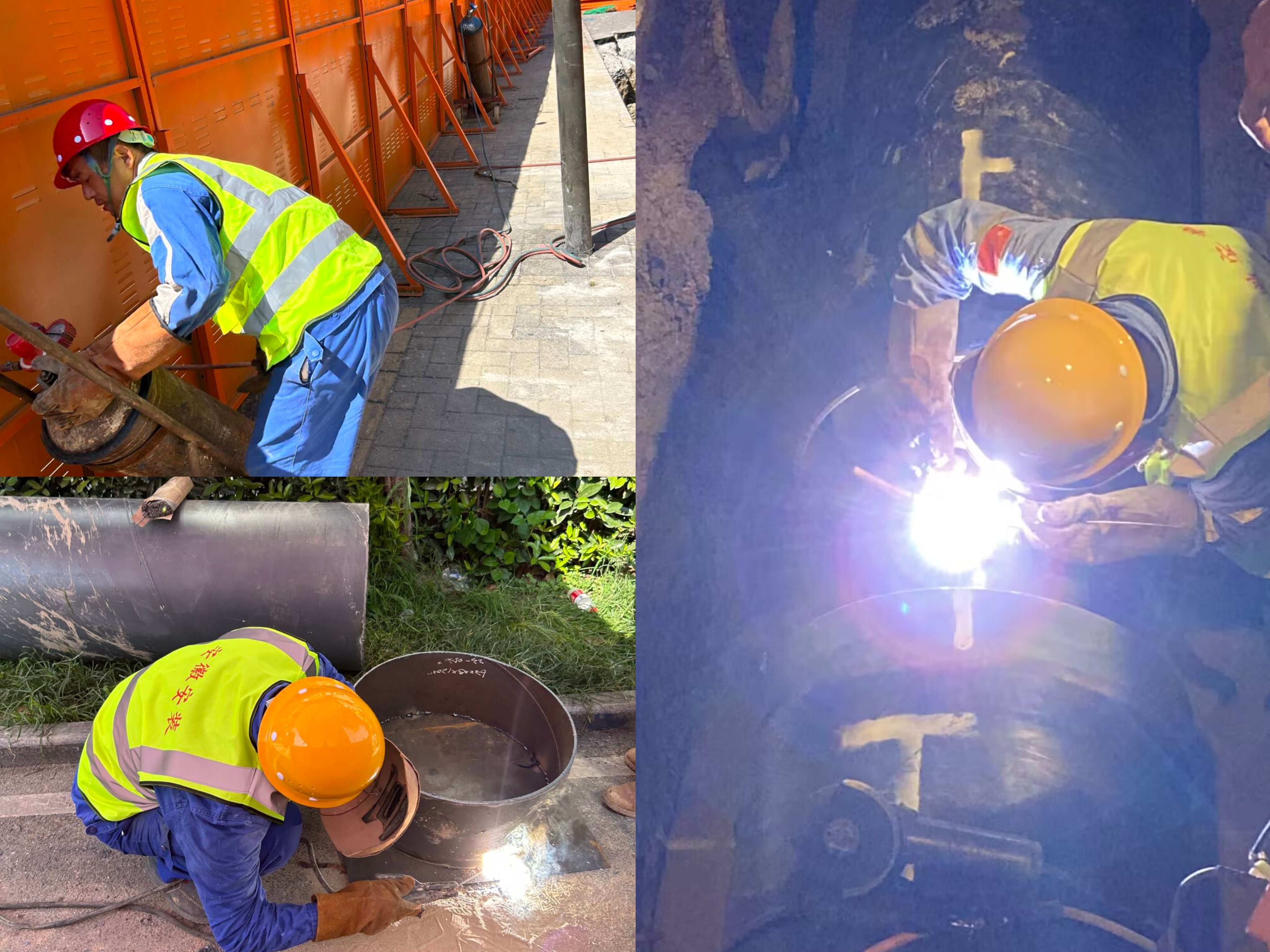 圖為:蕪湖路蒸汽管網(wǎng)改造工程乙炔瓶搬運(yùn)、套管焊接及直埋蒸汽保溫管道焊接施工