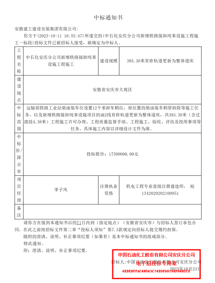 近日,建工安裝安慶分公司成功中標(biāo)中石化安慶分公司新增鐵路接卸純苯設(shè)施工程,中標(biāo)金額為1750萬元。