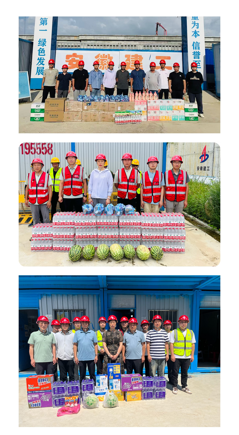 此次慰問先后來到新橋智能制造產業園、合肥七水廠、阜南第一小學、阜南污水廠等項目一線,將礦泉水、酸奶、綠豆、毛巾、十滴水、清涼油、風油精等防暑降溫物資送到一線職工的手中。慰問組一行與職工親切交談,感謝他們烈日下的堅守,叮囑他們要注意休息,勞逸結合,高溫作業時要注意安全、做好防暑降溫,保證安全工作與自身健康。