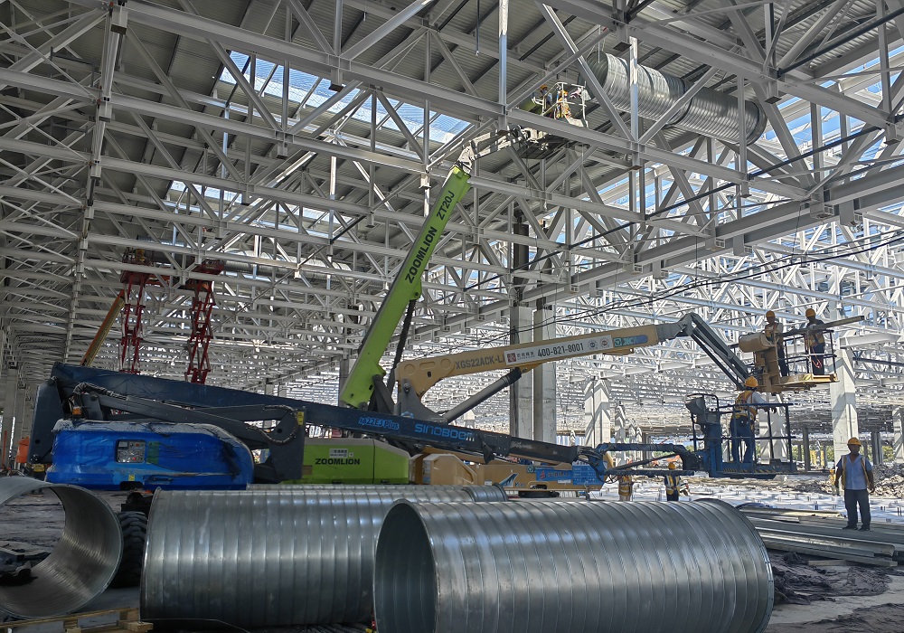 項目部全體管理人員緊抓施工節點,緊跟土建、鋼結構單位施工進度,全力統籌人、材、機合理高效入場,根據現場施工情況逐步優化各專業施工方案,全力推進施工進度。目前,車間一整體防雷接地已完成60%,QA辦公樓預埋已完成90%,隨著土建單位工作面的交接,車間一5區、6區正在進行成品支架、虹吸雨水管道、排水管、通風管道等施工作業。