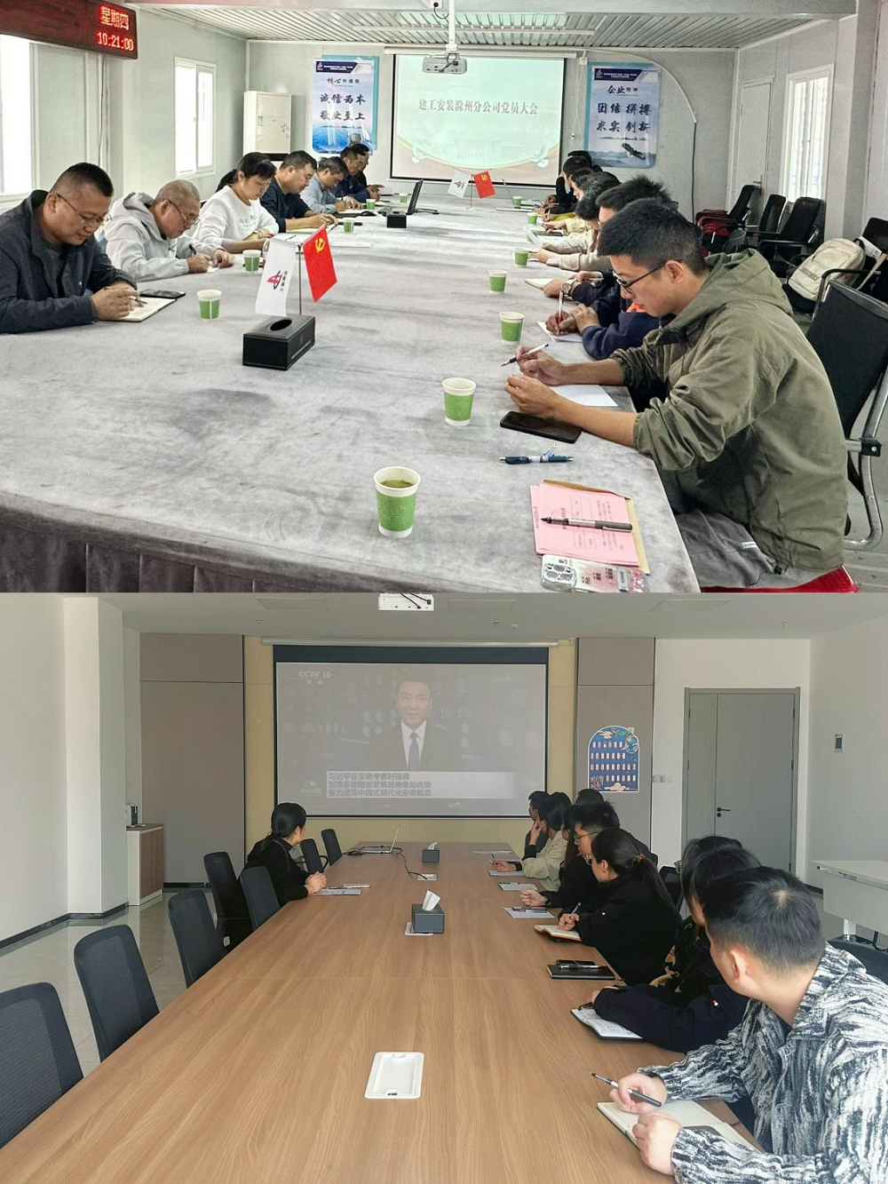 近日,建工安裝滁州分公司黨支部分別在機(jī)關(guān)和項(xiàng)目一線召開(kāi)會(huì)議,專(zhuān)題傳達(dá)學(xué)習(xí)習(xí)近平總書(shū)記考察安徽重要講話精神,分公司領(lǐng)導(dǎo)班子成員、黨員、機(jī)關(guān)及所屬項(xiàng)目部員工參會(huì)。